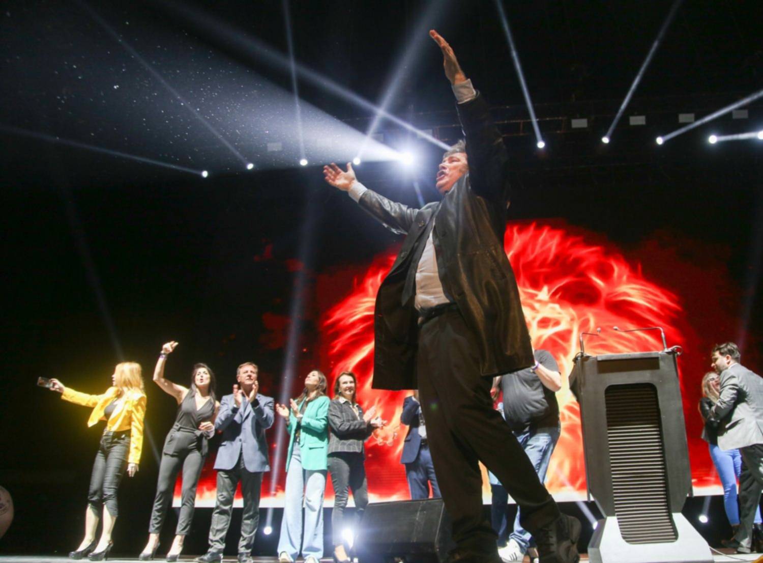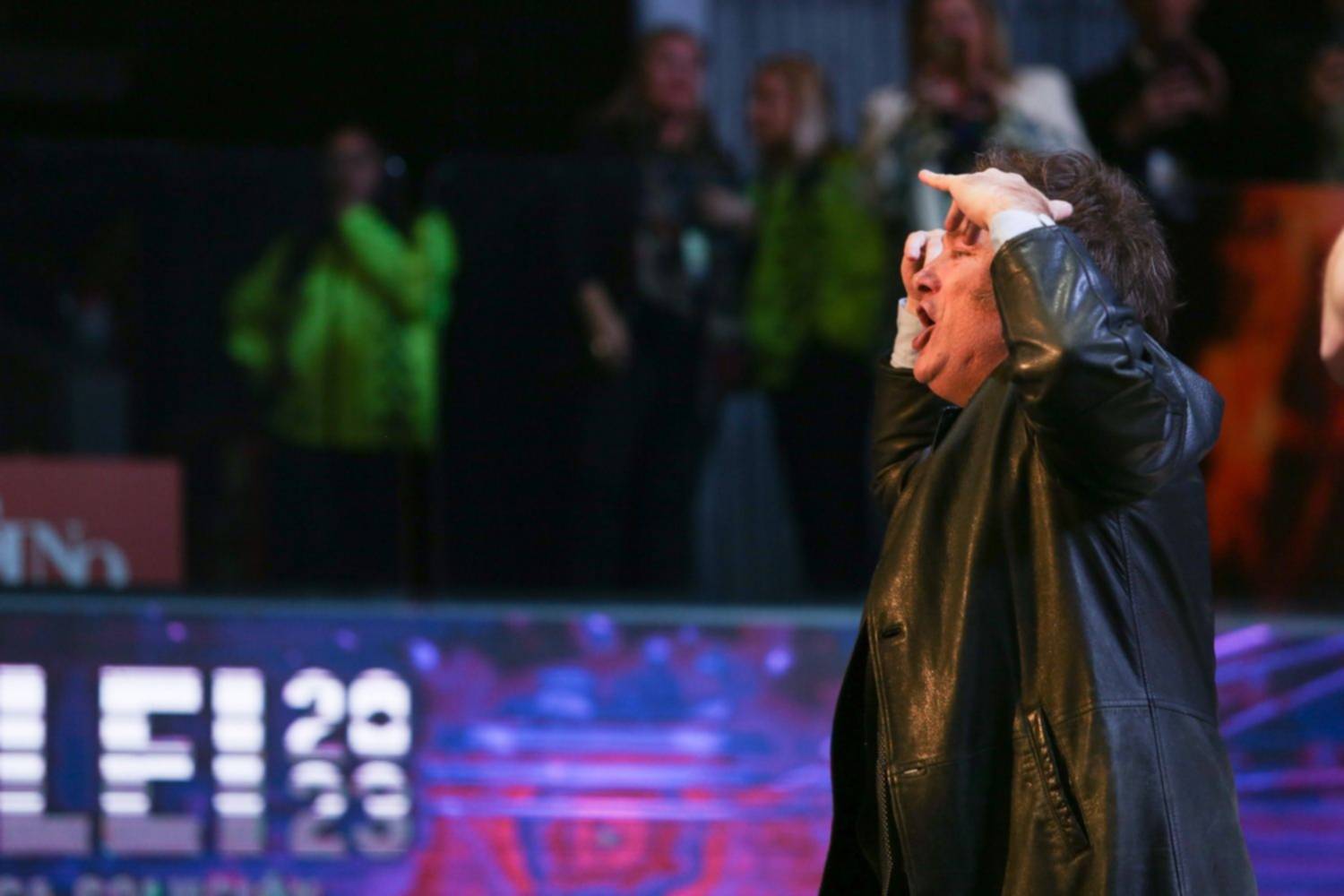 El postulante libertario ingresó al escenario con notoria demora y la transmisión del evento se entretuvo con mostrar a su novia, la comediante Florez, destacada invitada. Ante un estadio colmado, su presencia fue precedida por un video con imágenes de explosiones y edificios implosionando.