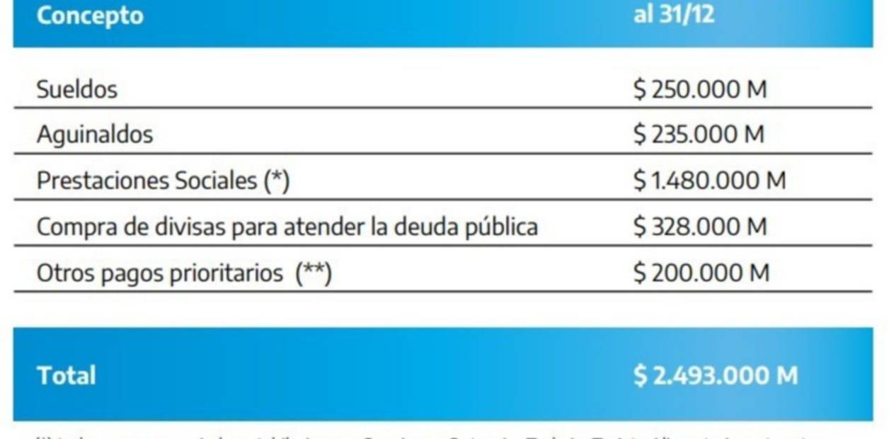 Al detallar la cobertura de las partidas prioritarias -por un total de $ 2.493.000 millones-, el documento precisa que prevén al cierre del ejercicio $ 250.000 millones para sueldos, $ 235.000 millones para aguinaldos, $ 1,48 billón para prestaciones sociales, $ 328.000 millones para la compra de divisas para atender la deuda pública y $ 200.000 millones para otros gastos, especialmente subsidios a la energía y el transporte.