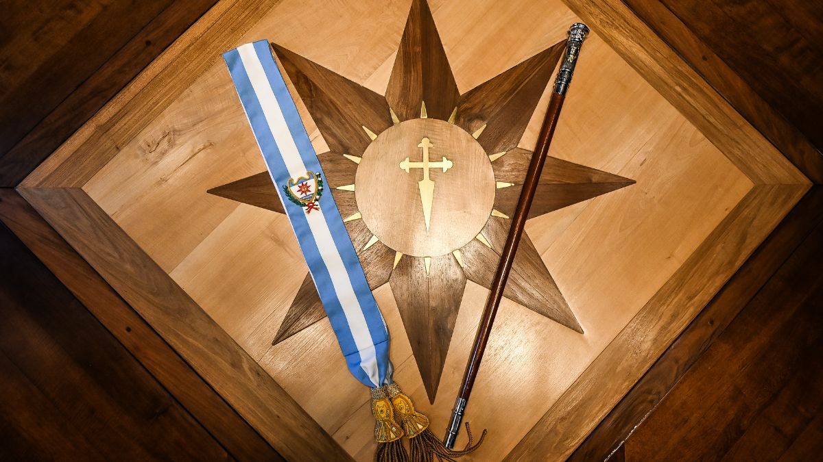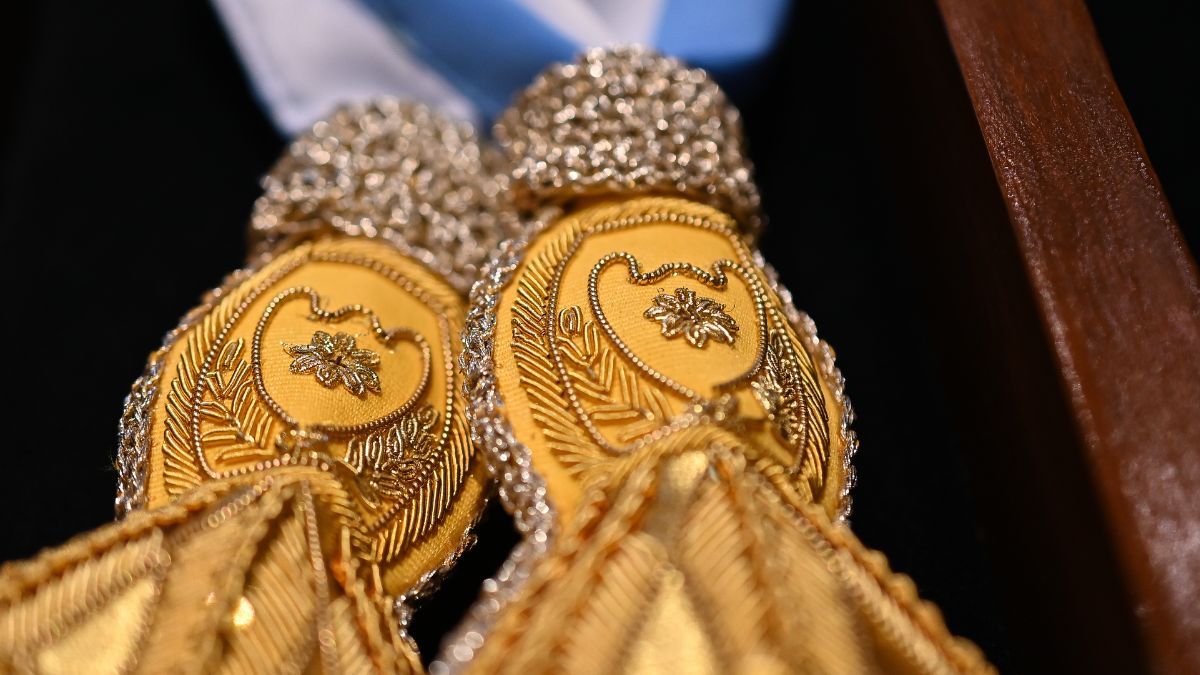 A su lado, la banda completa el lenguaje simbólico de la ceremonia. Confeccionada por la Sastrería Militar del Ejército Argentino (la misma institución responsable de los atributos que marcan la vida republicana del país) esta pieza fue hecha especialmente para la ocasión siguiendo los estándares históricos del Poder Ejecutivo.