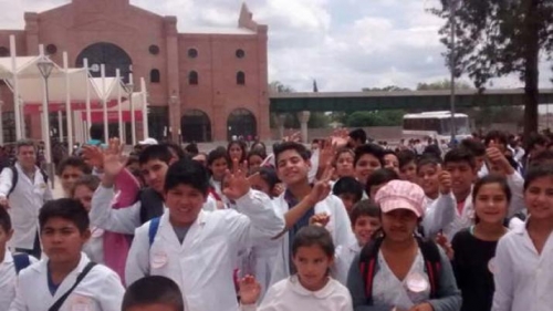 CAMPO GALLO, Copo (C). El intendente de Campo Gallo, Francisco Alanís y docentes de escuelas rurales del departamento Alberdi agradecen a la gobernadora Claudia de Zamora por haber hecho posible la visita a Tecnópolis. Los alumnos pertenecen a escuelas de los parajes El Maján, El Valle, La Fortuna, Santa Rosa, El Corrido, Simbol y La Unión, entre otros y las escuelas de Campo Gallo 1223, 703 y el colegio Virgen de Huachana.