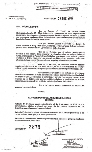 A través del decreto 2878 de este año, que lleva la firma del gobernador Domingo Peppo y del ministro de Gobierno, Juan José Bergia, el poder ejecutivo declaró asueto administrativo para los empleados provinciales para el 2 de enero 2017 e invitó a los demás poderes a sumarse.