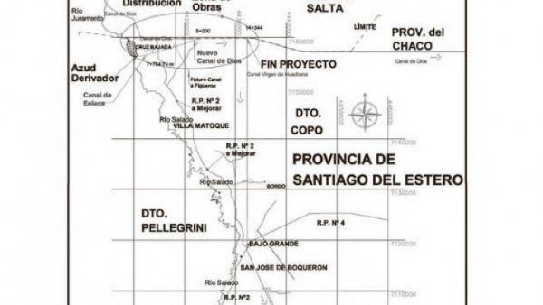 El azud se prevé ejecutar a unos tres kilómetros del límite con la provincia de Salta, en el paraje denominado Cruz Bajada; que permita derivar desde el río Salado a una conducción de enlace que abastezca en esta primera etapa al sistema hídrico del Canal de Dios.