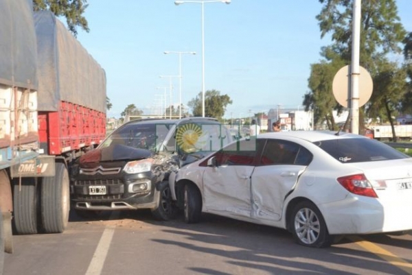 Tiempo de lectura: 39 segundosSAENZ PEÑA (Agencia)-Espectacular choque en cadena entre tres automóviles y un camión de carga, ocurrió esta tarde cerca de las 18 horas, en autovía de ruta 16 y calle 28, uno de los accesos más peligrosos que tiene la termal.