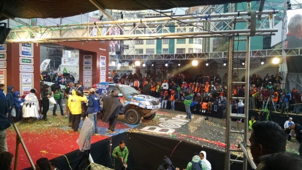 Fueron más de 60 mil las personas que soportaron el cambio climático, entre el calor del mediodía y la lluvia de la tarde solo para saludar a los competidores aunque se haya suspendido la etapa 6 entre Oruro y la mencionada ciudad. Ni el presidente de este país, Evo Morales, quiso perderse la llegada del Rally y desde el palco caminó hacia la pista cada vez que un vehículo asomaba. El mandatario del país del Altiplano obsequió oriolas de coca y luego, los participantes continuaron su camino.