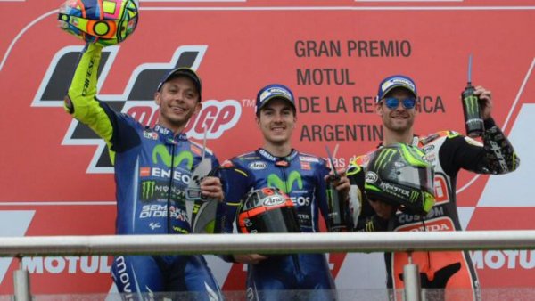 De esta forma, Yamaha logró el 1-2, Máverick Viñales consiguió su segundo triunfo en dos presentaciones y Valentino Rossi se subió al podio en su carrera número 350. El tercer puesto se lo llevó Cal Crutchlow, cuarto fue el español Álvaro Bautista y quinto el francés Johan Zarco.