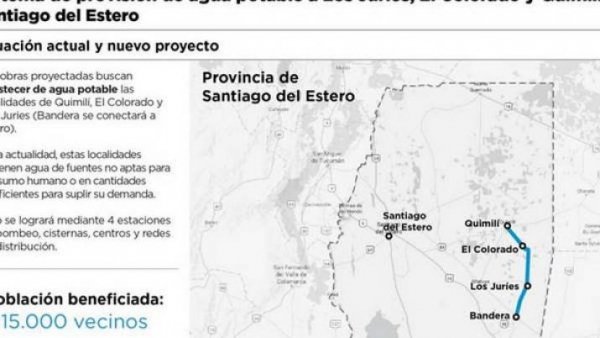 Con un 96% de ejecución, la obra que se concreta con fondos no reintegrables de la Corporación Andina de Fomento, procura satisfacer la demanda de agua potable de las localidades de Quimilí, El Colorado y Los Juríes, así como también de las zonas rurales aledañas, quedando preparadas para abastecer a Bandera (departamento Belgrano), con una futura prolongación del acueducto.