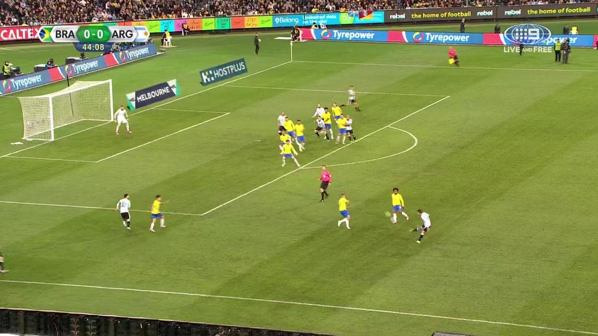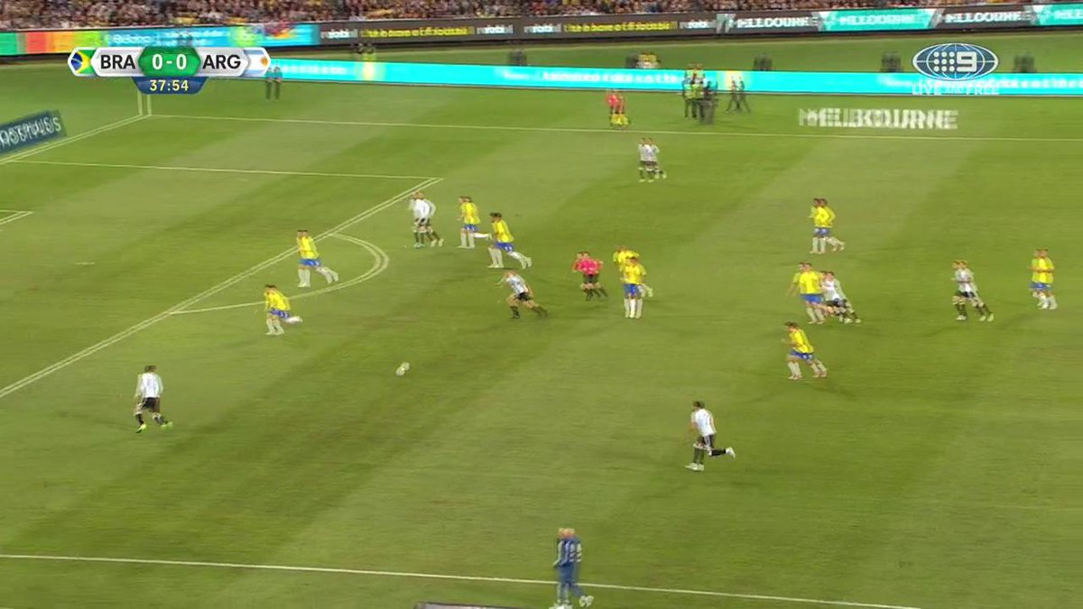 La albiceleste, con el debut de Jorge Sampaoli, en el banco, comenzó con buen ritmo, tratando siemprer la pelota con respecto, y jugando por abajo. Así a los 5 minutos llegó una de las jugadas más claras, cuando Di María quedó solo ante el arquero Weverton, pero la pelota pegó en el palo. Brasil también tuvo lo suyo con Gabriel Jesus enfrentó a Chiquito Romero, y cuando definía al gol, apareció la pierna salvadora de Mercado para tirar la pelota al córner. El partido en sí era parejo, los dos intentaban jugar por abajo, pero los hombres que más saben con la bola en los pies, como el caso de Lionel Messi en la Argentina, no aparecían. Entonces se jugaba lejos de los arcos. Las jugadas, por lo general, se diluían ante de llegar al área. Pero la Argentina insistió y Di María otra vez tuvo el gol en sus pies, y el arquero brasileño respondió en forma excelente (PT 30). La otra clara estuvo en los pies de Paulo Dybala, cuando Di María, después de una jugada personal, lo dejó sólo para el disparo, pero la tiró ancha. Cuando el primer tiempo se iba, Di María tiró un centro perfecto para Otamendi, el defesor cabeceó, la pelota dio en el palo, y de rebote, como número 9 Gabriel Mercado mandó la pelota a la red.