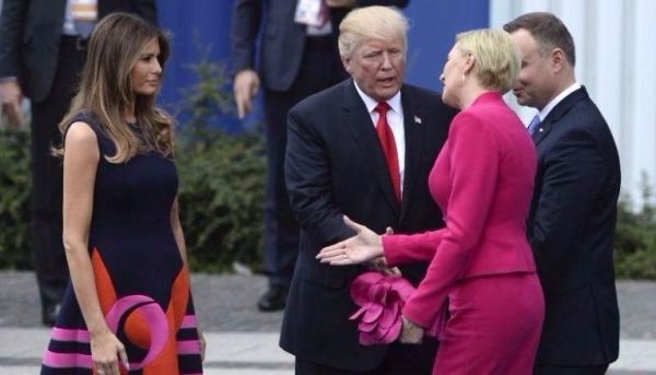 Donald Trump aterrizó el miércoles en Varsovia para asistir a una cumbre con varios mandatarios de la región y reunirse con el presidente POLACO, el ultraconservador Andrzej Duda, antes del arranque del G20 en Hamburgo. Duda acogió con los brazos abiertos al presidente estadounidense en un momento de fuerte tensiones con Bruselas. Pero su mujer, sin querer, no hizo lo mismo: cuando el inquilino de la Casa Blanca intentó estrechar la mano de la primera dama polaca, Agata Kornhauser, esta ignoró involuntariamente su gesto y siguió directa hacia Melania, a quien saludó primero bajo la mirada de Trump que se quedó con la mano colgando.