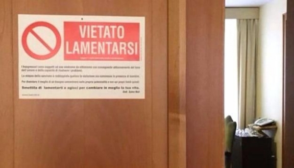 Bajo la advertencia explícita, el cartel rojo y blanco en italiano agrega que “los infractores están sujetos a un síndrome de victimismo con la consecuente disminución del sentido del humor y de la capacidad para resolver problemas”.