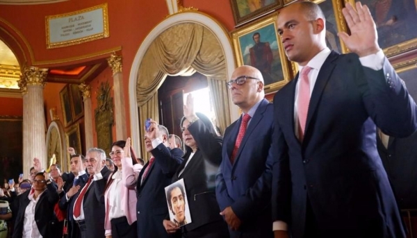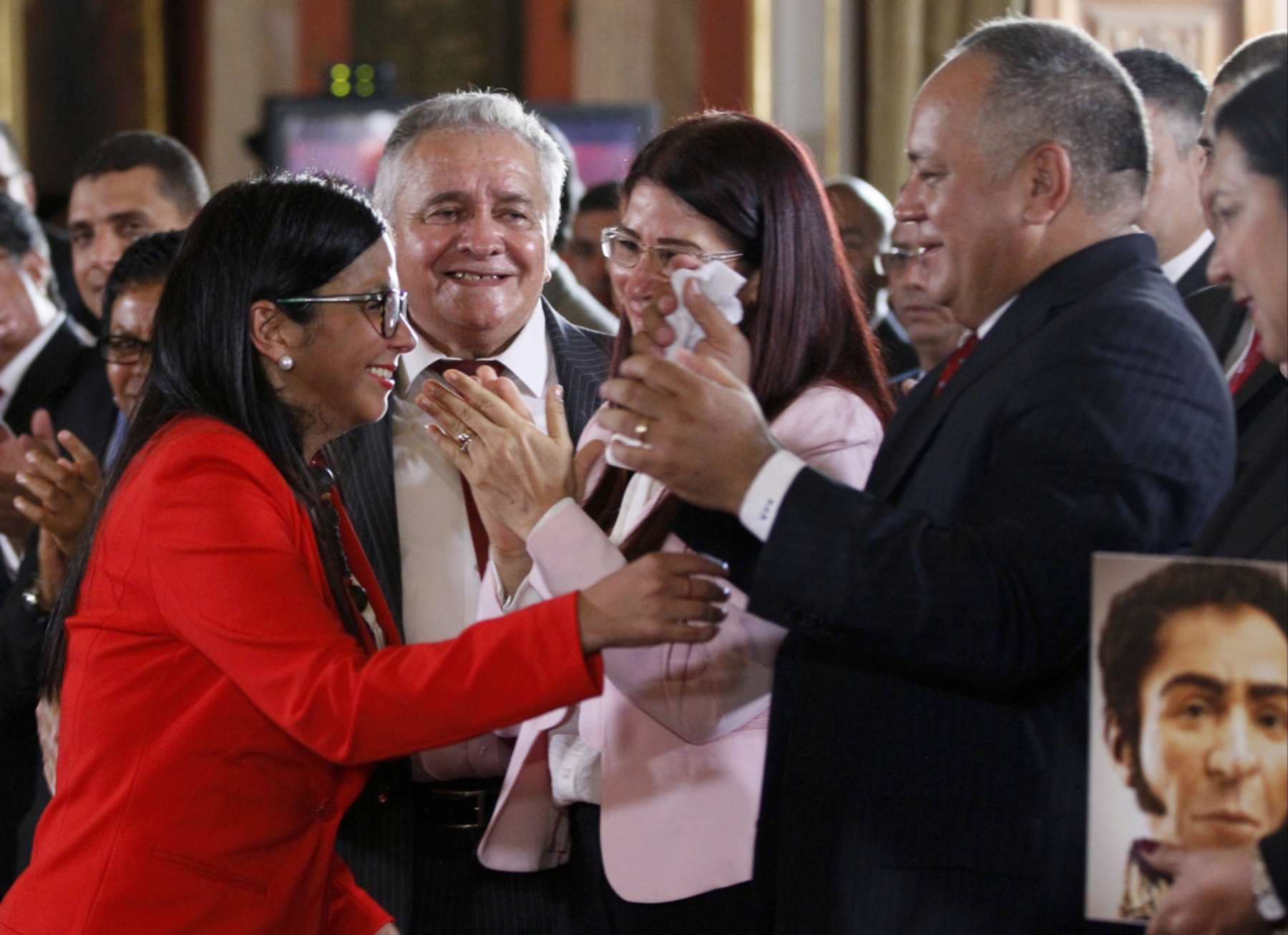 Ante los asambleístas elegidos y la plana mayor del chavismo, fue juramentada como presidenta la beligerante excanciller Delcy Rodriguez, de 48 años, quien prestó juramento con una bandera venezolana en la mano y la Carta Magna.