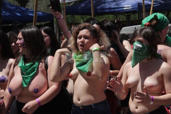 Algunas decenas de participantes del Encuentro Nacional de Mujeres, que se desarrolla desde ayer en Resistencia, se manifestaron hoy al mediodía frente a la Iglesia Catedral, donde con los pechos al descubierto reclamaron la legalización del aborto en la Argentina.