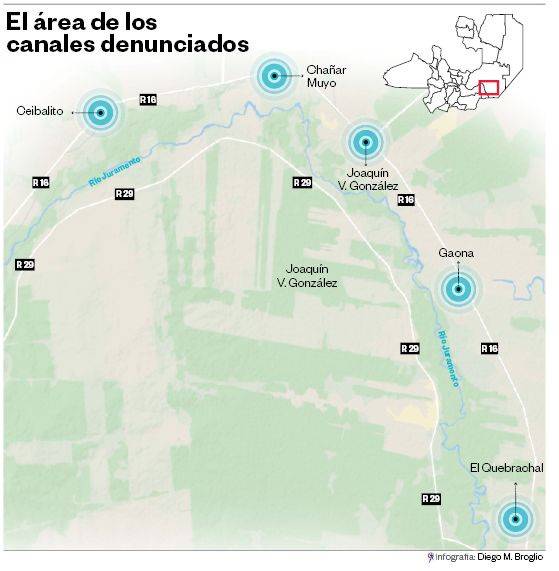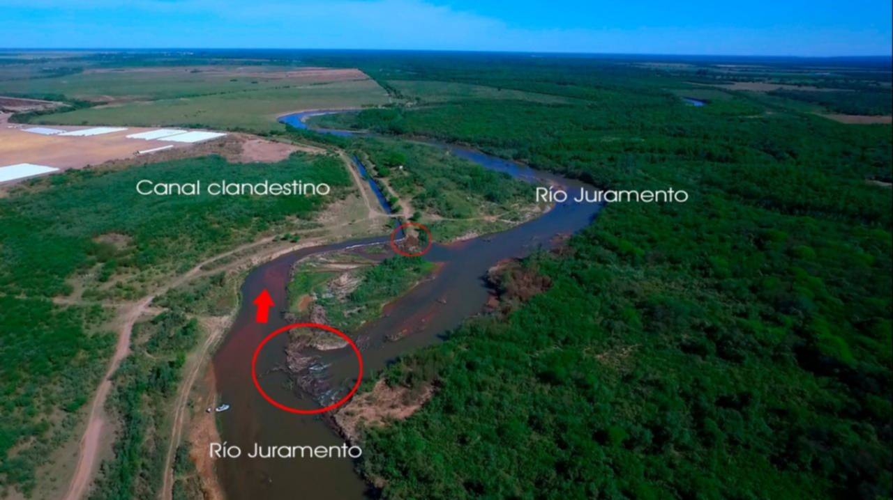 Entre las captaciones fijas cuestionadas en ese sector del Juramento se cuentan las tomas que abastecen a los campos de Miguel Sastre y otros productores de la zona de Gaona (de 2.500 litros por segundo) y las de las empresas Inversora Juramento (6.000 litros por segundo) y LIAG Argentina (11.000 litros por segundo). Otros grandes canales para riegos, ubicados en la zona de El Quebrachal, son los de El Mangrullo (1.500 litros por segundo) y Ruta 16 (3.000 litros por segundo).
