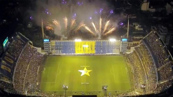 Junto a sus familiares, uno a uno los jugadores y el cuerpo técnico ingresaron al estadio, que en el medio tenía una estrella gigante con el número 67, los títulos que acumula el Xeneize a lo largo de su historia.