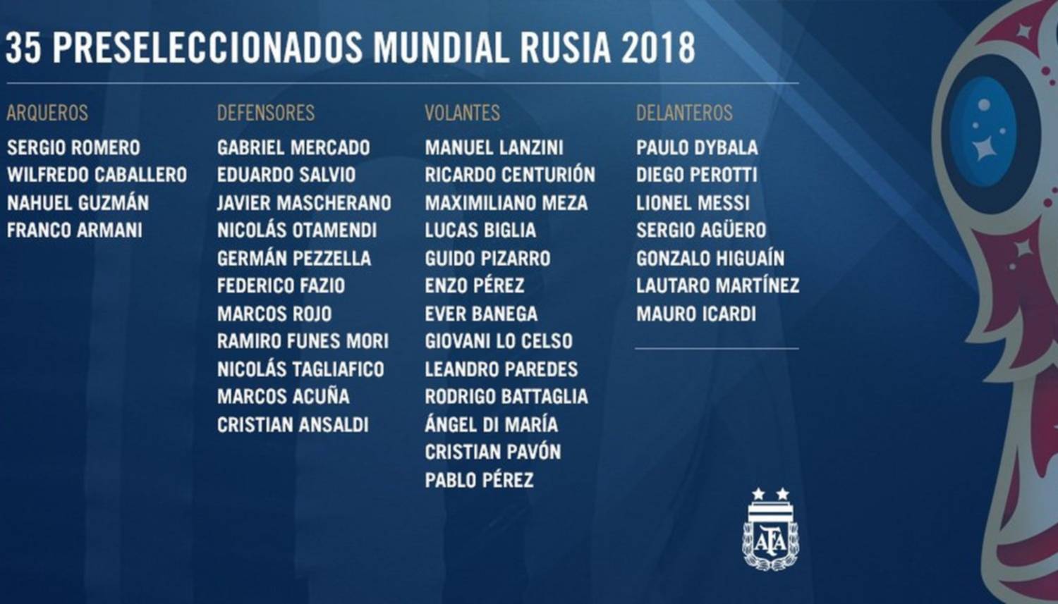 A través de las redes sociales de la Selección se conocieron los 35 nombres que forman parte de la primera lista de la Selección argentina para Rusia 2018. Ahora, el próximo jueves 17 de mayo, Jorge Sampaoli brindará una conferencia de prensa para anunciar a los 23 jugadores que viajarán al Mundial.