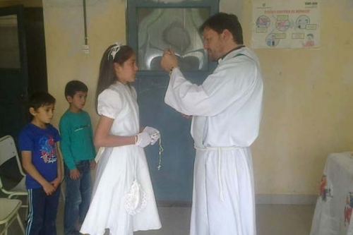 NUEVA ESPERANZA, Pellegrini (E) La escuela Nº 420 de la localidad de Monte Quemado, departamento Pellegrini, honró a su patrona, la Virgen de Fátima, con el oficio de una misa especial a cargo del padre Sergio Quinzio. La institución ubicada al pie del cerro El Remate cuenta con un director, Prof. Walter Ledesma y un maestro, Prof. Javier Balderrama. En esta jornada, Priscilla Ponce, alumna de la escuela, tomó su primera comunión. l