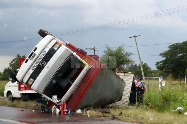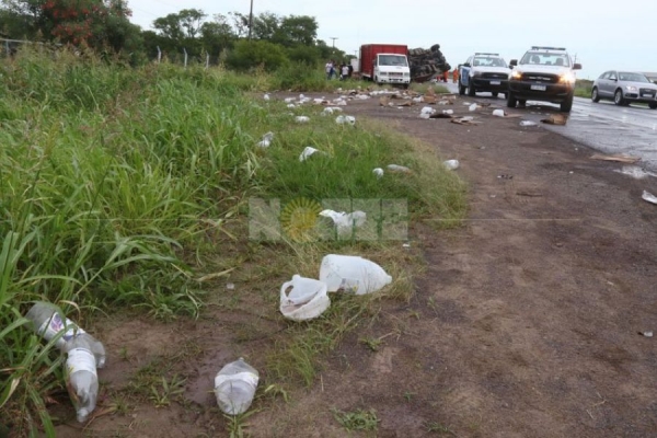 Por el impacto, el camión Mercedes Benz terminó volcando sobre la cinta asfáltica, ocasionando el desparramo total de los productos que llevaba.