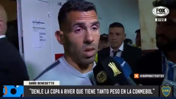 El delantero de Boca Juniors Carlos Tevez realizó declaraciones cuando abandonaba el Monumental y apuntó fuerte: “¿Por qué no le dan la Copa a River y listo? Si River hace lo que se le canta. Siempre lo hizo. Si hubiese sido al revés le daban la Copa”, afirmó.