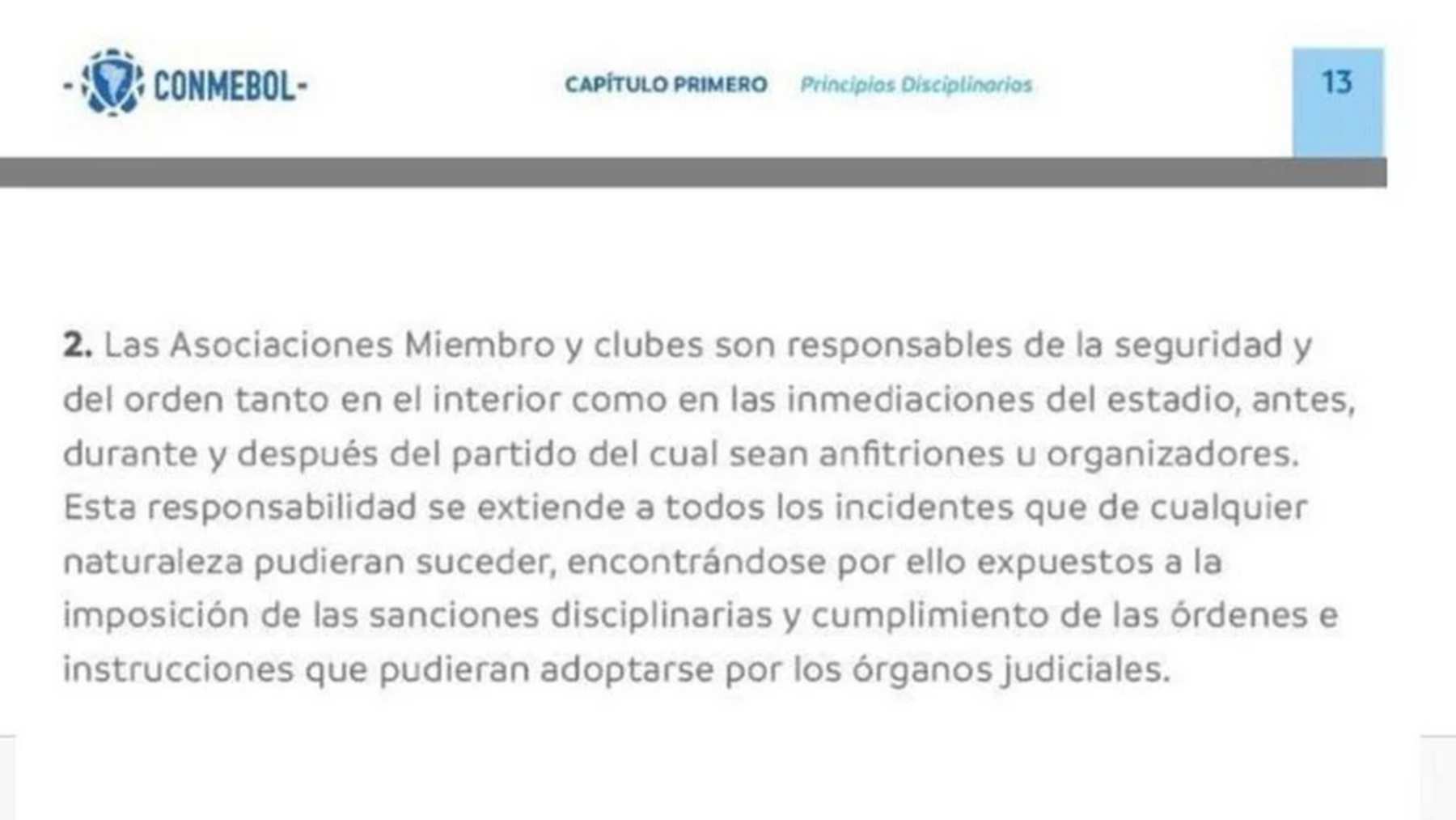 Según el reglamento disciplinario, sí. El inciso 2 del artículo 8 de este reglamento detalla que los clubes “son responsables de la seguridad y del orden tanto en el interior como en las inmediaciones del estadio, antes, durante y después del partido del cual sean anfitriones u organizadores”.