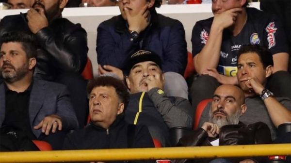 Maradona no estuvo en el banco de suplentes, ya que fue expulsado en el partido de ida. El entrenador debió vivir el partido desde la platea, con un handy en la mano.