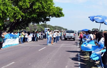 La manifestación en la ruta nacional se cumplió frente al acceso del poblado aborigen, donde los docentes de distintos niveles y modalidades se congregaron con banderas argentinas y carteles formando columnas a ambos lados de la cinta asfáltica.