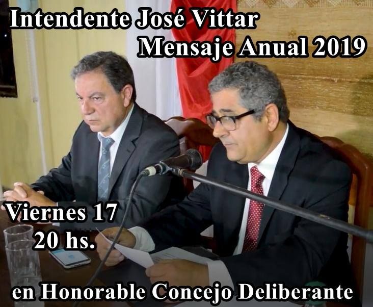 Tiempo de lectura: 7 segundosInvitamos a los Vecinos e Instituciones al Mensaje Anual 2019 del Intendente José Vittar Viernes 17 de Mayo 20:00 hs.en Sesión Especial del Honorable Concejo Deliberante de nuestra Ciudad