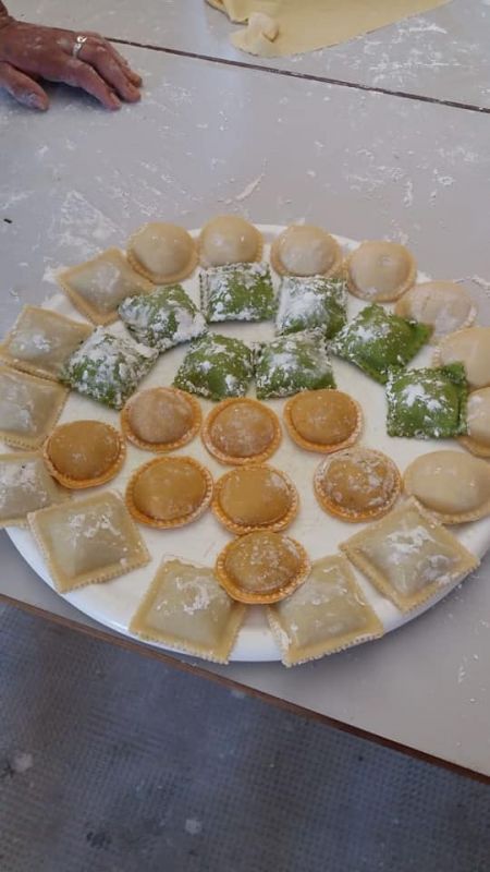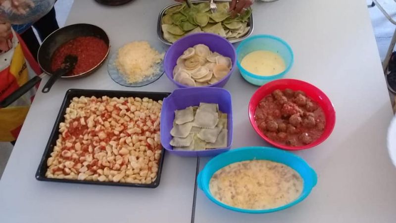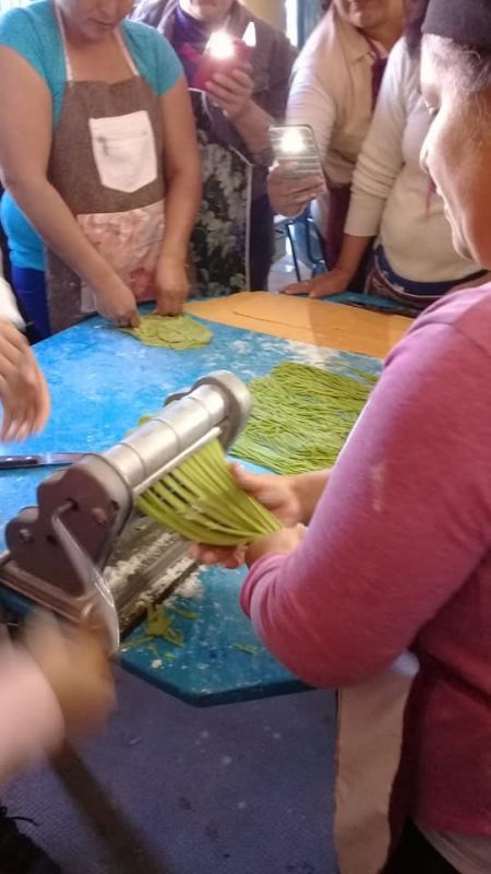 La clase fue de: Ñoquis, fideos de espinaca y fideos de morrón, sorrentinos y raviolones de calabaza y espinaca con salsa pariciene, crema y verdeo, filetto con albondigas.