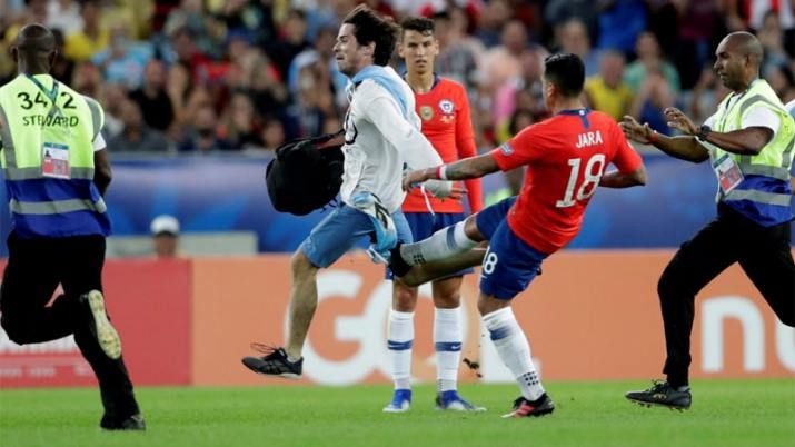 Este lunes volvieron a verse las caras en el triunfo 1 a 0 de la Celeste ante la Roja. Jara volvió a dar la nota no por una agresión a Cavani, sino a un hincha que ingresó a la cancha en el segundo tiempo. El volante cortó la corrida del intruso con una patada, pese a que no había sufrido ninguna agresión por parte del individuo.
