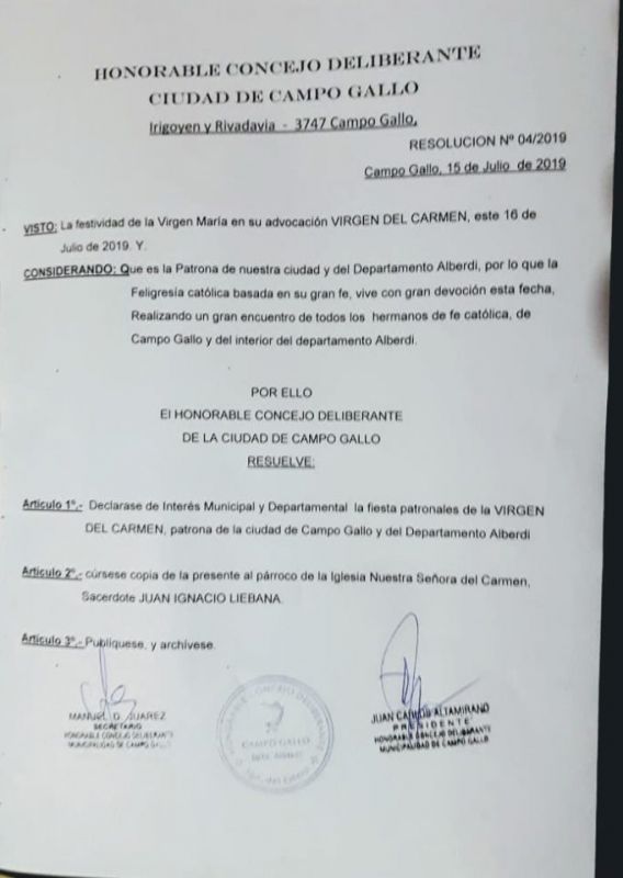 El Concejo Deliberante de la Ciudad de Campo Gallo mediante Resolución N° 04/2019 de fecha 15 de Julio, Declaró de Interés Municipal y Departamental las Fiestas Patronales de la Virgen del Carmen, Patrona de la Ciudad de Campo Gallo y del Departamento Alberdi