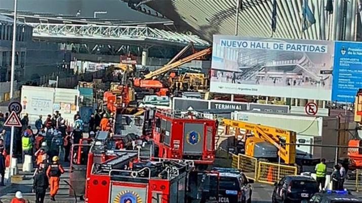 Al menos un obrero muerto y varios heridos, algunos trascendidos indican 7, es el saldo parcial de un derrumbe ocurrido en el aeropuerto de Ezeiza, durante los trabajos de remodelación del lugar.