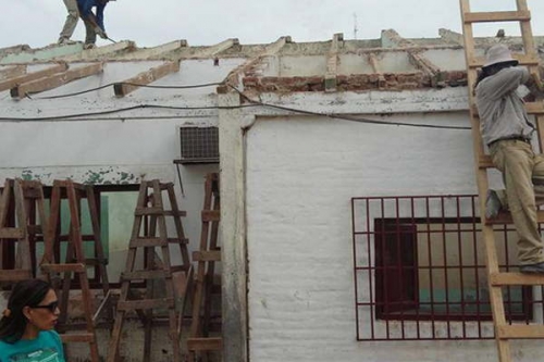 PAMPA DE LOS GUANACOS, Copo (C). Obreros de la Dirección de Obras Públicas de la Municipalidad de esta ciudad refaccionan el techo y pintan cuatro aulas de la Escuela Nº 1162, que se apresta a cumplir sus Bodas de Plata.