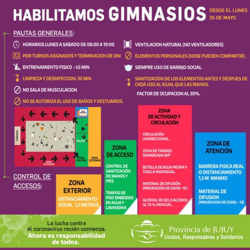 “Habilitamos de manera parcial los gimnasios, bajo estrictos protocolos y controles. Las personas mayores de 60 años también podrán realizar actividad física, con precaución. Respetemos todas las medidas de seguridad e higiene”, publicó Morales en su cuenta de Twitter, acompañando su mensaje con una imagen que resumió las pautas generales.