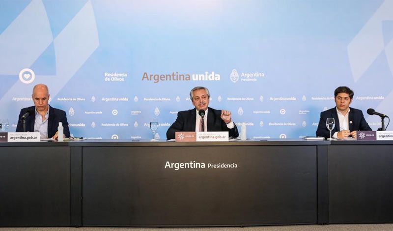 Fernández hizo el anuncio en la Residencia Presidencial de Olivos, acompañado por el gobernador de la provincia de Buenos Aires, Axel Kicillof, y el jefe de gobierno porteño, Horacio Rodríguez Larreta.