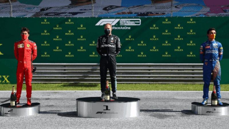 En un autódromo vacío de espectadores, los tres primeros en el trazado de Spielberg fueron entrevistados por la televisión oficial con distanciamiento social, recibieron sus premios con barbijos pero posaron en el podio ni hicieron el tradicional descorche de champagne.