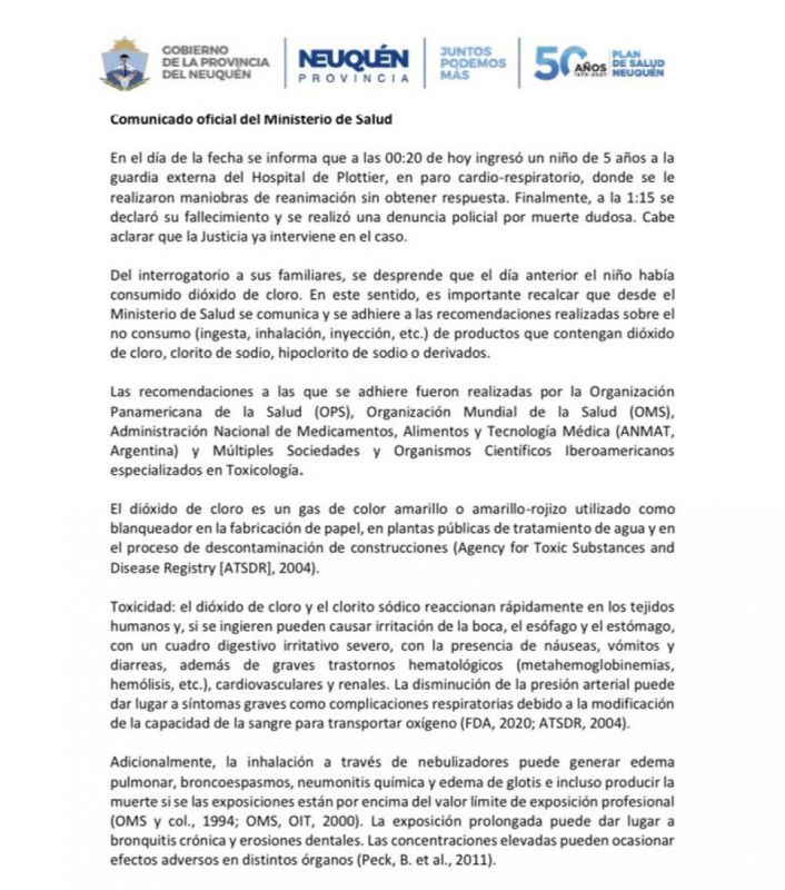 Ante la trascendencia de este caso, el ministerio de Salud neuquino adhirió a las recomendaciones realizadas sobre el no consumo de productos que contengan dióxido de cloro, clorito de sodio, hipoclorito de sodio o derivados.