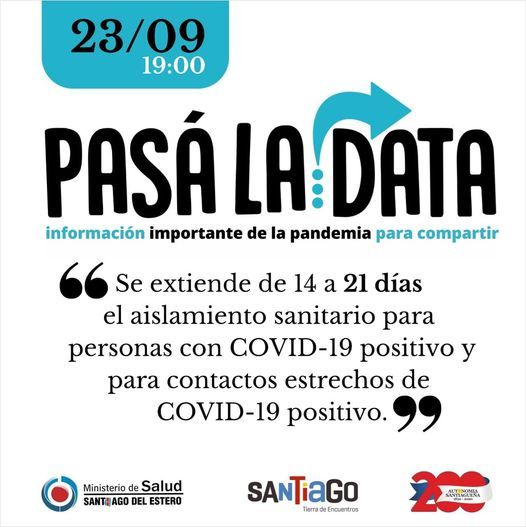 Este miércoles, a través de las redes sociales del Ministerio de Salud de Santiago del Estero se informó que “se extiende de 14 a 21 días el aislamiento sanitario para personas con Covid-19 y para contactos estrechos de Covid-19 positivo”.