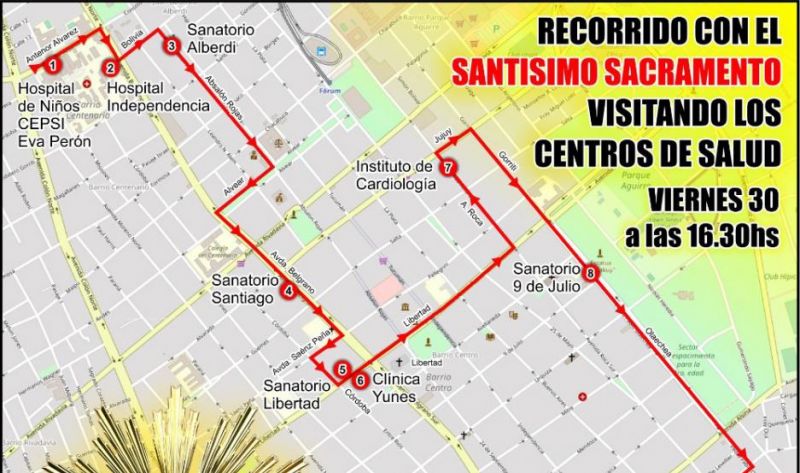 El recorrido con el Santísimo Sacramento tendrá continuidad por calle Olaechea hasta llegar a calle 3 de febrero que va directo hasta Av. Belgrano para poder llegar al hospital Regional que es el destino final del recorrido.