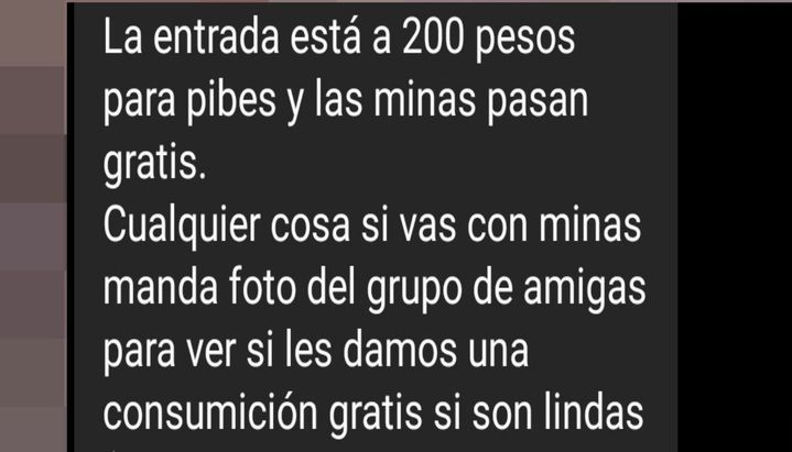 Sin embargo, el supuesto RRPP hace luego una discriminatoria aclaración que fue denunciada por los usuarios: “Cualquier cosa si vas con minas mandá foto del grupo de amigas para ver si les damos una consumición gratis si son lindas (y vemos de arreglar algo con vos también)”.