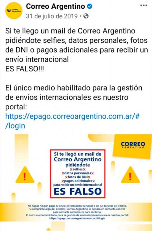 El correo claramente no forma parte de los canales de comunicación oficiales del correo, y años atrás, desde la entidad emitieron un comunicado advirtiendo justamente sobre mails maliciosos pidiendo información.