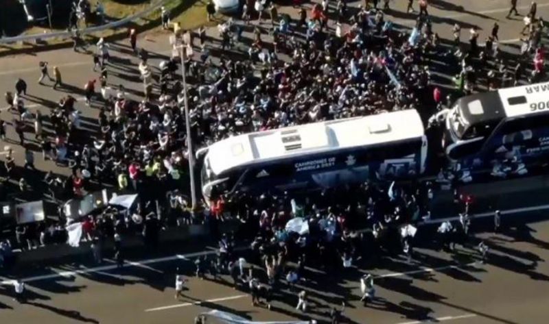 A pesar de que se había descartado cualquier posibilidad de un recorrido por la 9 de julio para que la gente salude a los campeones, en el camino a Ezeiza los micros fueron seguidos por una enorme cantidad de hinchas.