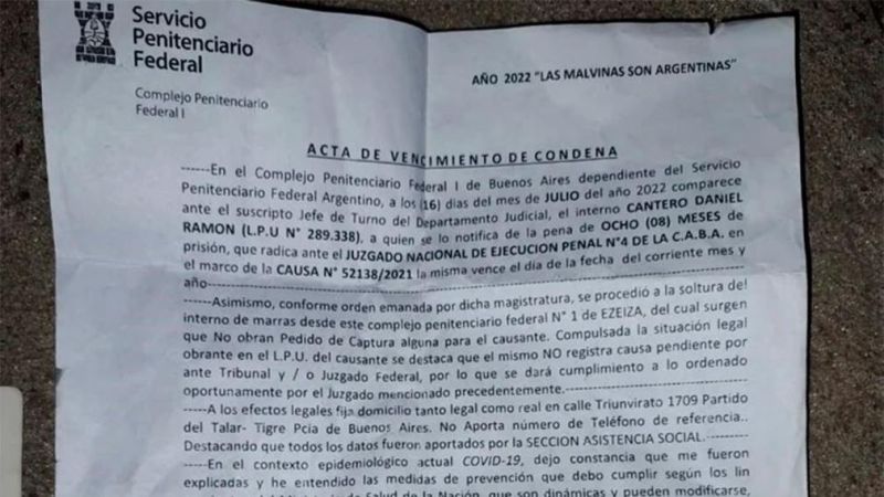 Su salida del complejo penitenciario era tan reciente que, al momento del robo del vehículo de Martín Pigna, los dos tenían en sus bolsillos las actas de liberación que fueron encontradas entre sus pertenencias cuando los agentes los revisaron. También hallaron el arma blanca que utilizaron para realizar el robo.