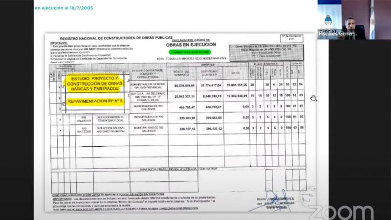Para ejemplificar sus dichos, el fiscal mostró cada una de esas obras en las que expuso el mecanismo por el cual en las licitaciones competían Austral Construcciones, Kank y Costilla y Gotti y en otras empresas (en su mayoría Petersen), que siempre quedaba descalificada.