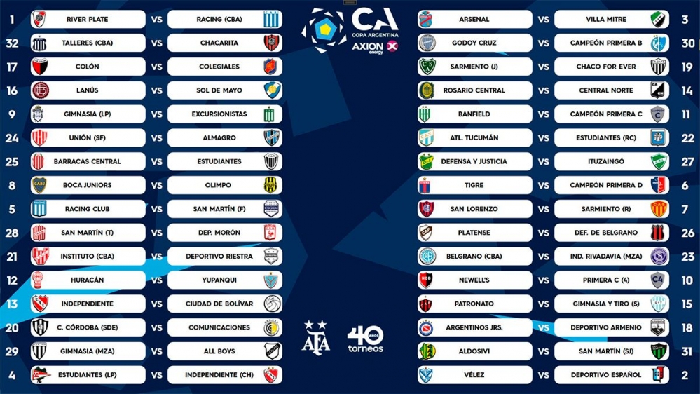 Por su parte, River enfrentará a Racing de Córdoba y Boca se medirá con Olimpo de Bahía Blanco, Independiente chocará con Ciudad de Bolívar, Racing con San Martín de Formosa y San Lorenzo con Sarmiento de Resistencia. Patronato, flamante campeón, chocará con Gimnasia y Tiro de Salta.