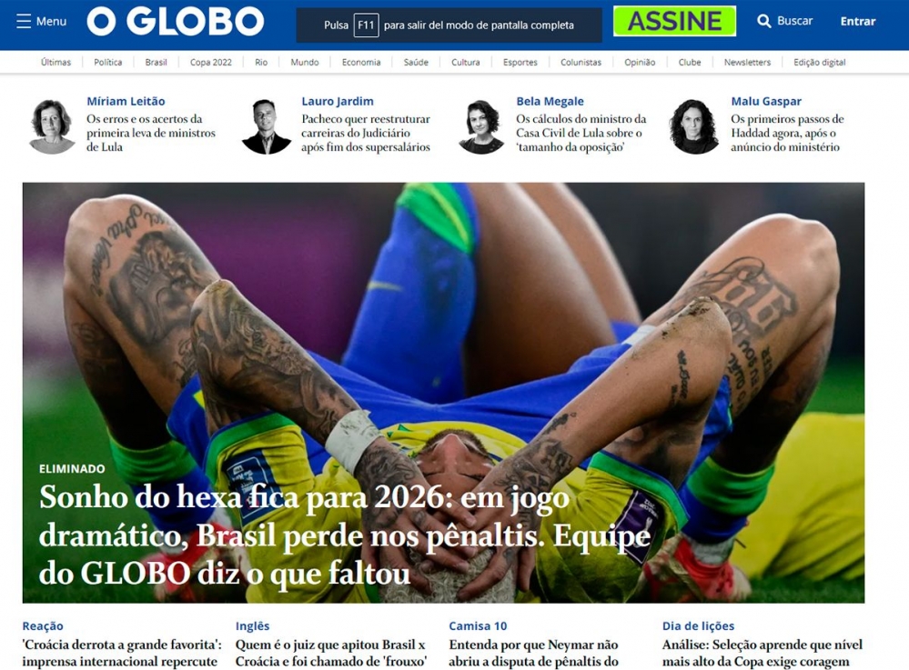 Los medios brasileños lamentaron hoy la eliminación de su seleccionado en los cuartos de final del Mundial Qatar 2022, luego de perder por penales por 4 a 2 ante Croacia (en el alargue empataron 1 a 1), en el estadio Education City de Doha.