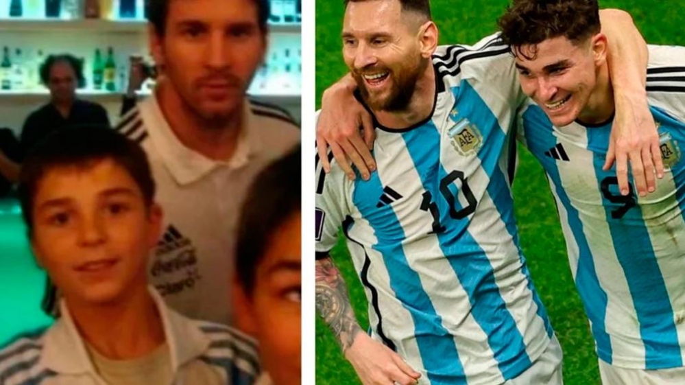 Julián está junto a sus hermanos mayores en el hotel donde concentraba la Selección. En el plano original, se ve que están delante de una barra con bebidas desde la que los mozos también le sacan fotos a Messi.
