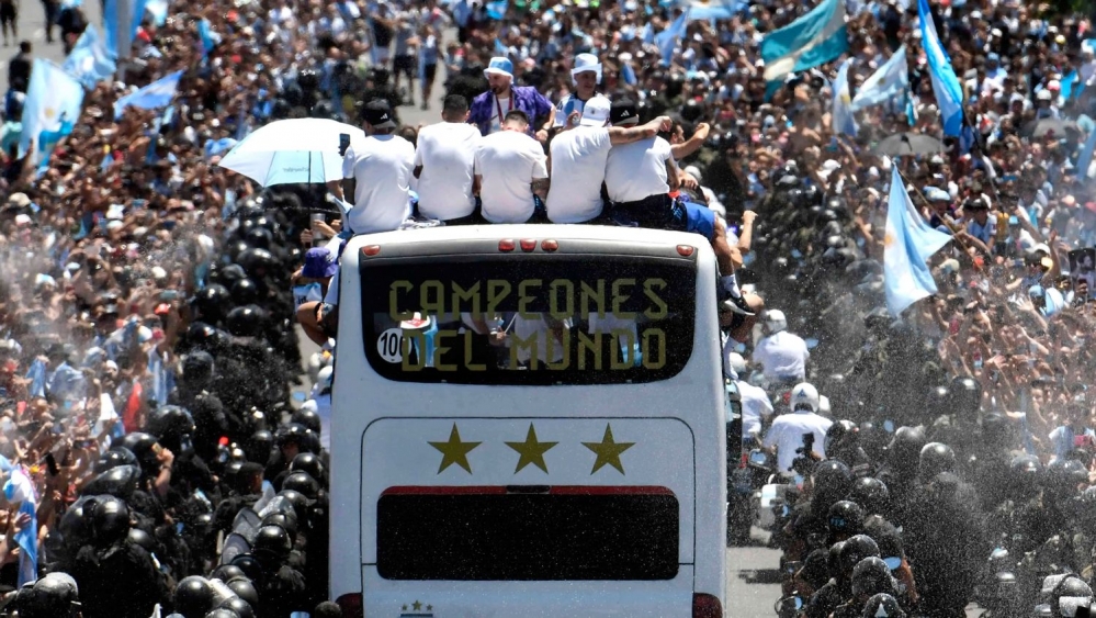 Más de 4 millones de personas salieron a la calle para festejar el título obtenido en el Mundial de Qatar con la Selección y, ante el fervor popular, colapsaron las zonas del Obelisco, Plaza de Mayo, AU 25 de mayo y Autopista Dellepiane, razón por la cual el micro que traslada al plantel campeón del mundo se desvió —una vez dentro de la Ciudad de Buenos Aires— hacia la Escuela de Cadetes de la Policía Federal en el barrio porteño de Lugano. Una vez allí, los vencedores en Qatar subieron a helicópteros para sobrevolar y saludar a las multitudes en los distintos puntos de la ciudad, para luego regresar al predio de Ezeiza.