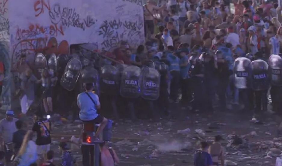 Según trascendió, todo comenzó cuando Infantería y los Bomberos intentaron bajar a dos hombres que permanecían en la cima del emblemático monumento porteño, vandalizado horas antes a la espera de los jugadores de la albiceleste. Allí comenzó el caos que terminó de la peor manera.