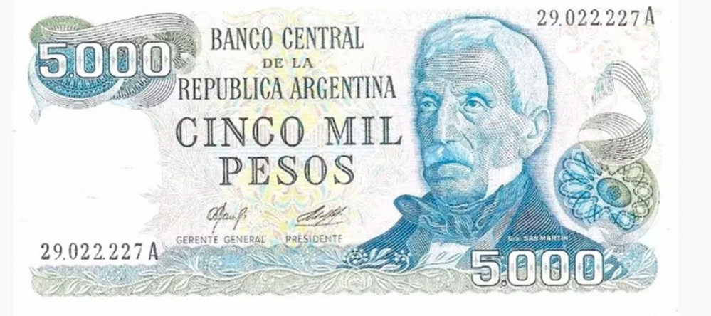 Argentina ya tuvo billetes de 5.000 pesos en el pasado. Por desagios y cambios de signo monetario ya hubo una emisión en la década de 1960, luego reapareció en 1977 con la imagen de José de San Martín anciano. Tras una quita de ceros llegó un billete de $5.000 con la imagen de Juan Bautista Alberdi en 1984. Y con con el cambio de moneda durante el gobierno de Raúl Alfonsín llegó en 1989 la emisión de 5.000 australes con el retrato de José Juárez Celman.