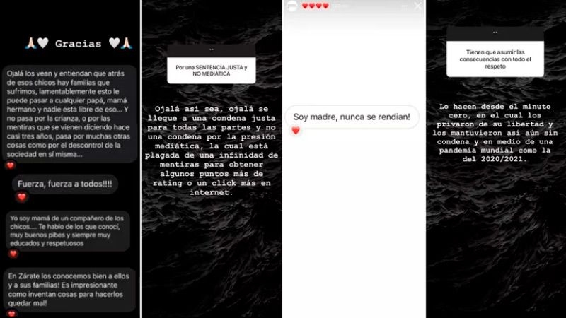 Volviendo a la cuenta de Instagram “Rugbiers Zarate”, que es la que aglutina a la mayor cantidad de seguidores, en un apartado de las “historias destacadas”, quien maneja el usuario publicó mensajes de apoyo que le llegaron por privado. Incluso se lee uno perteneciente a un familiar de alguno de los acusados. Lo escribió en la previa al inicio del juicio oral, sabiendo que el publico en general iba a observar por primera vez el rostro de los detenidos: “Ojalá los vean y entiendan que atrás de esos chicos hay familias que sufrimos, lamentablemente esto le puede pasar a cualquier papá, mamá, hermano y nadie esta libre de eso… No pasa por la crianza o por las mentiras que se vienen diciendo hace casi tres años, pasa por muchas otras cosas como por el descontrol de la sociedad en sí misma”.