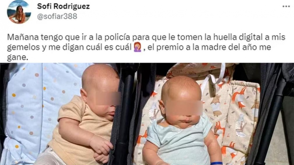 “Mañana tengo que ir a la policía para que le tomen la huella digital a mis gemelos y me digan cuál es cuál, el premio a la madre del año me gané”, escribió una usuaria de Twitter en su cuenta, y el mensaje destapó una ola de repercusiones, además de capturar la atención de sus seguidores, que no dejaron de preguntarle cómo seguía la historia. Sofía Rodríguez, la mamá de los bebés de 45 días de vida, contó un poco más de la situación mientras respondía las consultas y explicó qué pasó una vez que acudió a la comisaría en búsqueda de una solución.
