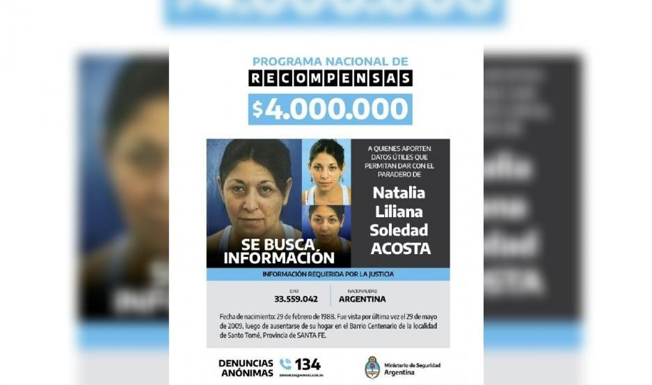 La recompensa para quienes aporten datos útiles o tengan conocimiento del paradero de Natalia Acosta fue establecida en 4 millones de pesos, a lo que se suma la publicación y difusión del retrato de la joven al momento de su desaparición y de la progresión de su imagen generada con un programa de inteligencia artificial, que permite contar con una foto actualizada de la mujer.